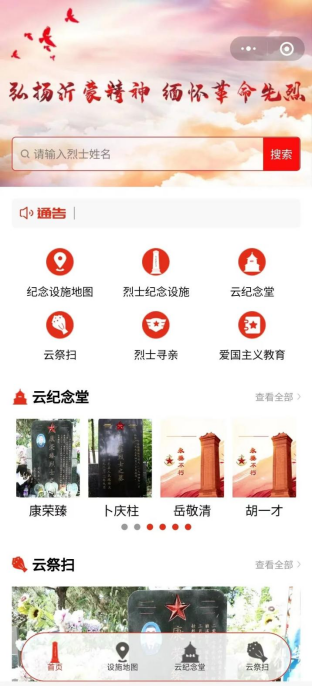 此平台是通过“小程序 VR”相结合的方式,搭建线上云祭扫平台,构建“互联网 ”时代的一种新的祭扫方式。打造以纪念设施地图、烈士纪念设施、云纪念堂、云祭扫、爱国主义教育等主题的数字化平台,突破时间、地点等阻隔,为开展网上祭扫、英烈褒扬、爱国主义教育等活动提供便利。